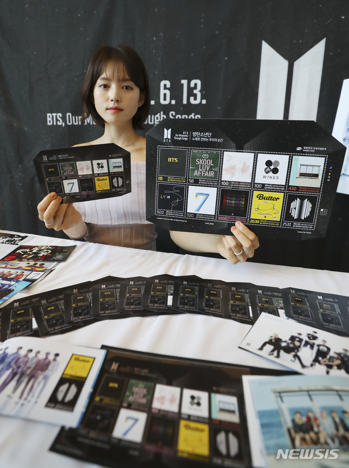 [서울=뉴시스] 최진석 기자 = 12일 서울 중구 서울중앙우체국에서 모델이 방탄소년단(BTS)의 지난 10년의 역사를 담은 기념우표를 선보이고 있다. 2023.06.12. [email protected]