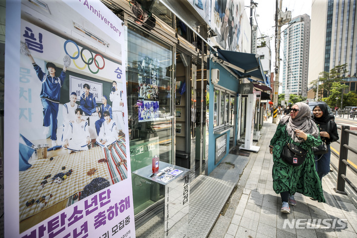 [서울=뉴시스] 정병혁 기자 = 방탄소년단(BTS) 데뷔 10주년을 하루 앞둔 12일 서울 용산구의 한 카페에 BTS 굿즈가 놓여 있다 .2023.06.12. [email protected]