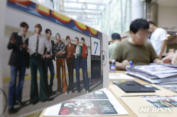 [서울=뉴시스] 고승민 기자 = 데뷔 10주년을 맞은 방탄소년단(BTS)의 기념우표가 발행된 13일 서울중앙우체국에서 우표를 대량으로 구매한 시민이 우표에 날짜 도장을 찍고 있다. 2023.06.13. [email protected]