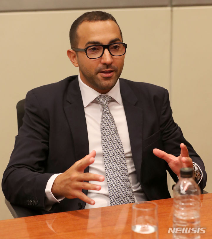 [서울=뉴시스] 김선웅 기자 = 셰이크 파힘 알 카쉬미 서울국제도서전 샤르자 사절단장이 14일 제65회 서울국제도서전이 열리고 있는 서울 강남구 코엑스에서 한국 매체와 인터뷰를 하고 있다. 2023.06.14. [email protected]