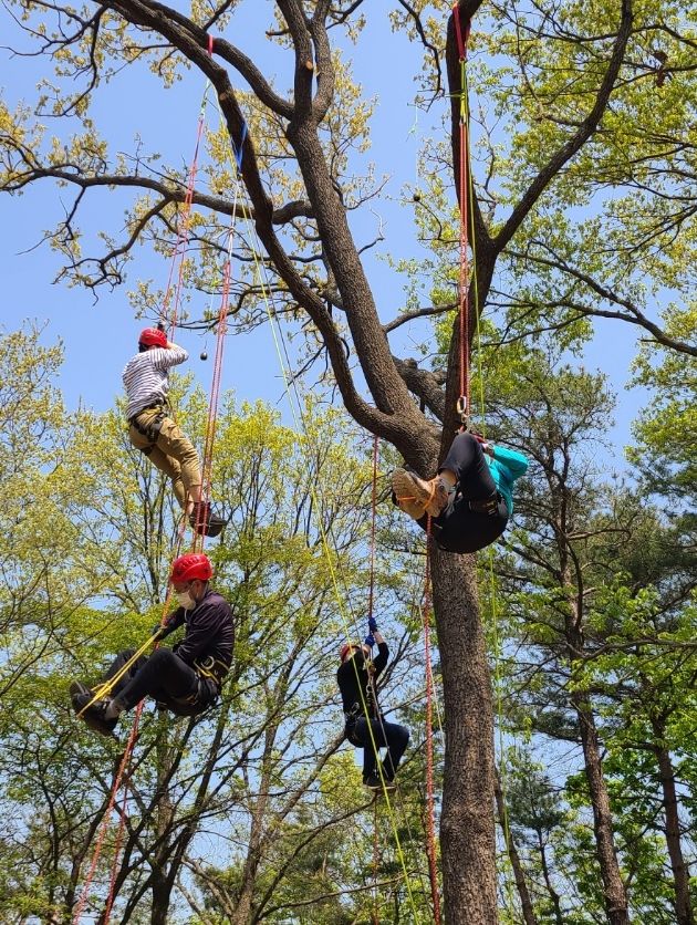 밧줄 이용해 나무 오르는 청소년들