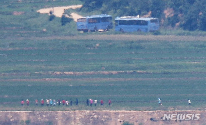 [파주=뉴시스] 권창회 기자 = 북한 노동당 중앙위원회 제8기 제8차 전원회의 확대회의가 지난 16일 김정은 국무위원장이 참석한 가운데 당 중앙위 본부에서 열렸다고 조선중앙통신이 17일 보도했다. 전원회의는 며칠간 이어질 것으로 예상된다. 사진은 18일 오후 경기 파주시 오두산 통일전망대에서 바라본 북한 황해북도 개풍군 일대 모습. 2023.06.18. [email protected]