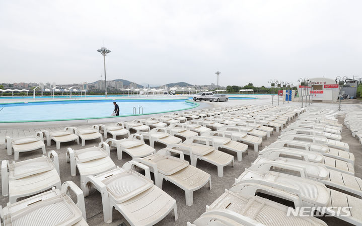 [서울=뉴시스] 김금보 기자 = 20일 서울 서초구 잠원 한강공원 수영장에 선베드 등 물품이 놓여있다. 서울시 한강사업본부는 오는 23일부터 8월20일까지 뚝섬, 광나루, 여의도, 잠원 한강 야외수영장과 양화, 난지물놀이장을 운영할 계획이다. 2023.06.20. [email protected]