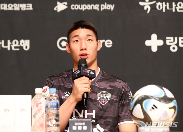 [서울=뉴시스] 김명년 기자 = FIFA U-20 월드컵 4강 주역 김준홍(김천 상무)가 21일 오전 서울 종로구 아산정책연구원에서 열린 'U-20 월드컵 활약 K리거 미디어데이에서 소감을 밝히고 있다. 2023.06.21 [email protected]