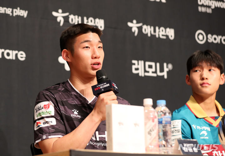 [서울=뉴시스] 김명년 기자 = FIFA U-20 월드컵 4강 주역 김준홍(김천 상무)가 21일 오전 서울 종로구 아산정책연구원에서 열린 'U-20 월드컵 활약 K리거 미디어데이에서 소감을 밝히고 있다. 2023.06.21 [email protected]