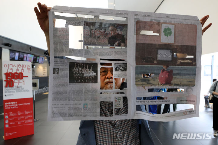 [서울=뉴시스] 박진희 기자 = 한국 실험미술의 대부 성능경 작가가 21일 서울 종로구 국립현대미술관에서 '한국 실험미술 1960-70년대' 전시 일환으로 '신문읽기' 퍼포먼스를 하고 있다. 행위예술 '신문읽기'는 신문을 자르고, 오려내고, 읽는 반복 행위를 통해 정보의 허구성과 사라져가는 종이신문에 대한 향수를 불러 일으킨다. 2023.06.21. [email protected]