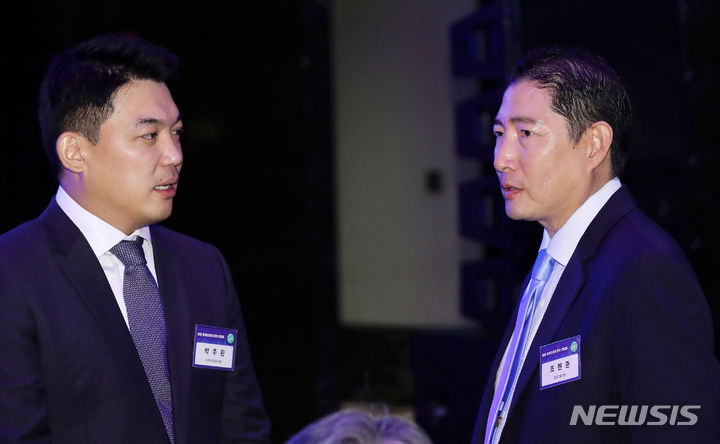 [하노이=뉴시스] 홍효식 기자 = 조현준(오른쪽) 효성 회장과 박주환 티케이지태광 회장이 22일(현지시간) 하노이 한 호텔에서 열린 동행 경제인 만찬 간담회에 앞서 대화하고 있다. 2023.06.23. [email protected]