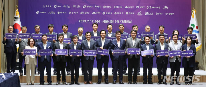 [서울=뉴시스] 황준선 기자 = 오세훈 서울시장과 정문헌 서울시 구청장협의회장을 비롯한 서울시 구청장·부구청장들이 12일 오전 서울 중구 서울시청에서 열린 서울시-구청장협의회 건전재정 공동선언식에서 기념촬영을 하고 있다. 2023.07.12. [email protected]