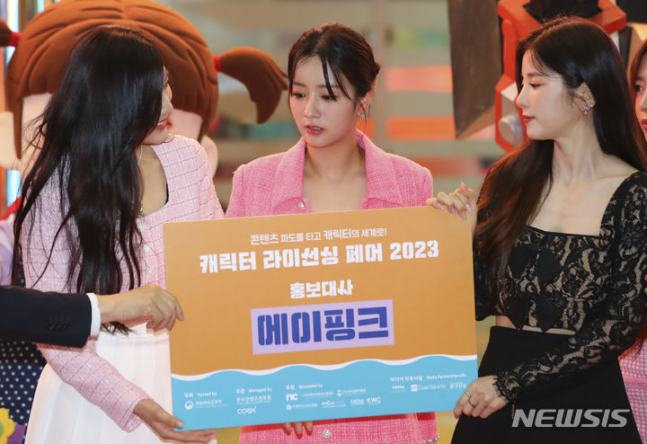 [서울=뉴시스] 최진석 기자 = 13일 서울 강남구 코엑스에서 열린 '캐릭터 라이선싱 페어 2023'에서 걸그룹 에이핑크 오하영, 윤보미, 박초롱이 홍보대사로 위촉, 기념촬영을 하고 있다. 2023.07.13. [email protected]