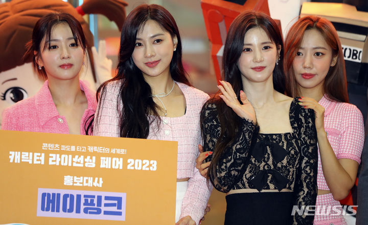 [서울=뉴시스] 최진석 기자 = 13일 서울 강남구 코엑스에서 열린 '캐릭터 라이선싱 페어 2023'에서 걸그룹 에이핑크 윤보미, 오하영, 박초롱, 김남주가 홍보대사로 위촉, 기념촬영을 하고 있다. 2023.07.13. [email protected]