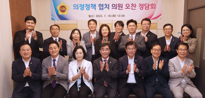 [수원=뉴시스] 이병희 기자 = 염종현(더불어민주당·부천1) 경기도의회 의장이 18일 오후 수원의 한 음식점에서 지역 현안 발굴 및 정책추진 의견 수렴을 위한 '경기도의회 의정정책 협치 오찬'을 마치고 도의원들과 기념사진을 찍고 있다. (사진=경기도의회 제공) 2023.07.18. [email protected]