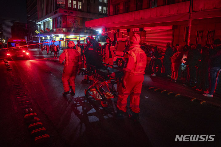 [요하네스버그=AP/뉴시스] 19일(현지시각) 남아프리카공화국 요하네스버그 시내에서 가스 폭발이 일어나 구조대원들이 현장에 모여 있다. 경찰은 교통 혼잡시간대에 지하 가스가 폭발해 도로가 파손되고 차량 20여 대가 전복해 최소 9명이 다쳤다고 밝혔다. 경찰은 2차 폭발 위험과 건물 붕괴 우려로 건물 내 주민들을 대피시켰다. 2023.07.20.