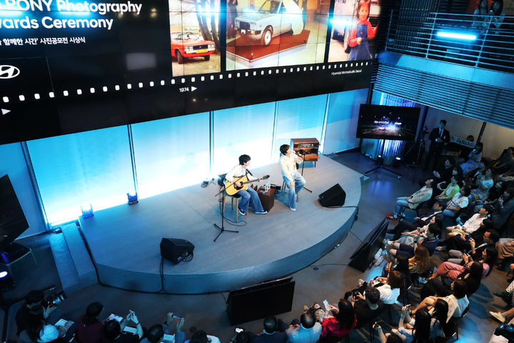 [서울=뉴시스] 이영환 기자 = 밴드 잔나비가 지난 22일 현대모터스튜디오 서울에서 열린 포니와 함께한 시간 사진 공모전 시상식에서 특별공연을 하고있다. (사진=현대자동차 제공) 2023.07.23. [email protected]