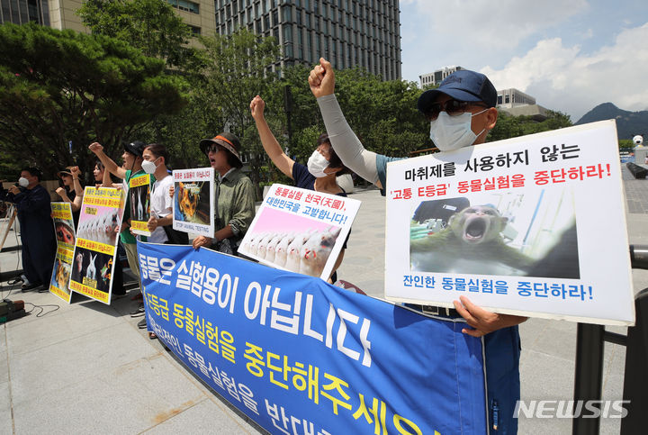 [서울=뉴시스] 권창회 기자 = 한국동물보호연합 회원들이 26일 오후 서울 종로구 광화문광장에서 동물실험 규탄 기자회견에서 구호를 외치고 있다. 2023.07.26. [email protected]