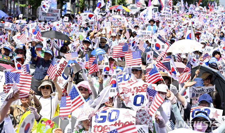 [평택=뉴시스] 김종택 기자 = 한국전쟁 정전협정 70주년인 27일 오후 경기도 평택시 팽성읍 주한 미군기지 캠프 험프리스 안정리게이트 앞에서 대한민국바로세우기 국민운동본부 등 보수단체 회원들이 한미동맹 강화를 외치고 있다. (사진=경기일보 제공) 2023.07.27. [email protected]
