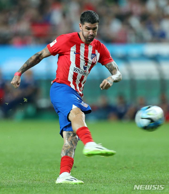 [서울=뉴시스] 최진석 기자 = 27일 서울 마포구 서울월드컵경기장에서 열린 쿠팡플레이시리즈 1차전 팀 K리그와 아틀레티코 마드리드의 경기. 아틀레티코 마드리드 로드리고 데폴이 슛을 날리고 있다. 2023.07.27. [email protected]