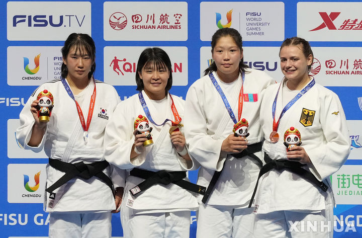 [청두=신화/뉴시스] 이윤선(왼쪽)이 지난달 31일(현지시각) 중국 쓰촨성 청두에서 열린 제31회 청두하계세계대학경기대회(유니버시아드) 여자 유도 78㎏급에서 은메달을 목에 걸고 시상대에 올라 포즈를 취하고 있다. 이윤선은 결승전에서 스기무라 미즈키(일본)에 누르기 한판으로 패해 은메달을 땄다. 2023.08.01.