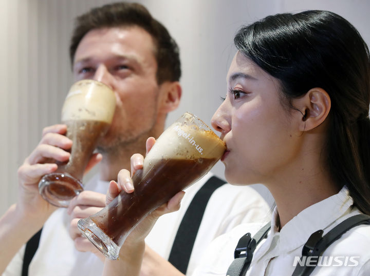 [서울=뉴시스] 김진아 기자 = 1일 오전 서울 마포구 엔제리너스 홍대L7점에서 모델들이 엔제리너스 '아메리치노 코젤다크&코젤제로'를 선보이고 있다. 아메리치노 신제품은 코젤 다크 시나몬의 아메리치노 버전으로 알코올을 제외하고 오직 흑맥주의 향과 시나몬 슈거를 담은 '아메리치노 코젤다크'와 최근 제로 열풍을 겨냥해 제로 칼로리와 디 카페인의 특징을 담은 '아메리치노 코젤제로' 등 2종이다. 2023.08.01. [email protected]