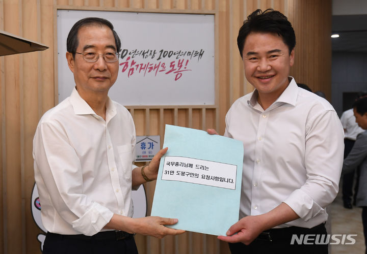 오언석 도봉구청장으로 부터 요청사항 전달받는 한덕수 총리