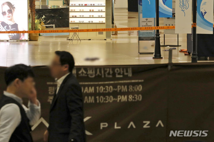 [성남=뉴시스] 조성우 기자 = 경찰이 3일 오후 묻지마 흉기난동이 발생한 경기도 성남시 분당구 서현역 한 백화점에서 사건현장을 통제하고 있다. 피의자 A씨는 경차를 몰고 서현역 앞 인도로 돌진, 보행자 다수를 충격한 뒤 내려 역사 안으로 들어가 흉기를 휘두른 것으로 전해졌다. 현재 파악된 부상자는 차량 충격 4명에 흉기 피해 9명 등 13명이다. 2023.08.03. [email protected]
