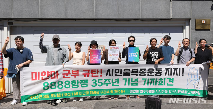 [서울=뉴시스] 권창회 기자 = 미얀마 민주주의를 지지하는 한국시민사회단체모임 회원들이 8일 오전 서울 성동구 미얀마대사관 무관부 앞에서 열린 8888항쟁 35주년 기념 기자회견에서 퍼포먼스를 하고 있다. 2023.08.08. [email protected]