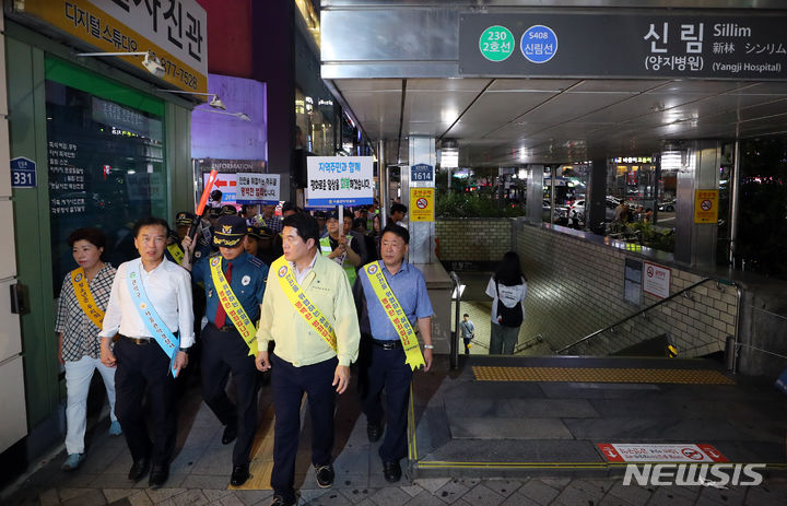 [서울=뉴시스] 최진석 기자 = 정태호(앞줄 왼쪽부터) 더불어민주당 의원과 박민영 서울관악경찰서장, 박준희 관악구청장이 8일 서울 관악구 신림역 순대타운 일대에서 지역상인회, 자율방범대 등 유관기관과 함께 특별범죄예방 합동순찰을 하고 있다. 2023.08.08. [email protected]
