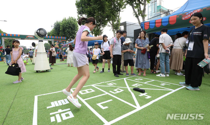 [서울=뉴시스] 최진석 기자 = 19일 서울 종로구 대학로 차없는 거리 행사를 찾은 시민들이 전통이놀이를 즐기고 있다. 이번 '대학로 차없는 거리 with SKKU' 행사는 지난 6월부터 시범적으로 시행되고 있는 대학로 차없는 거리 행사의 일환이다. 2023.08.19. [email protected]