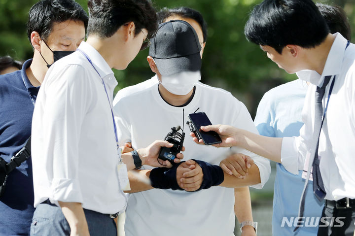[서울=뉴시스] 최동준 기자 = 미성년자 의제강간 혐의를 받는 피의자가 25일 서울 서초구 서울중앙지방법원에서 열린 영장실질심사에 출석하고 있다. 2023.08.25. [email protected]