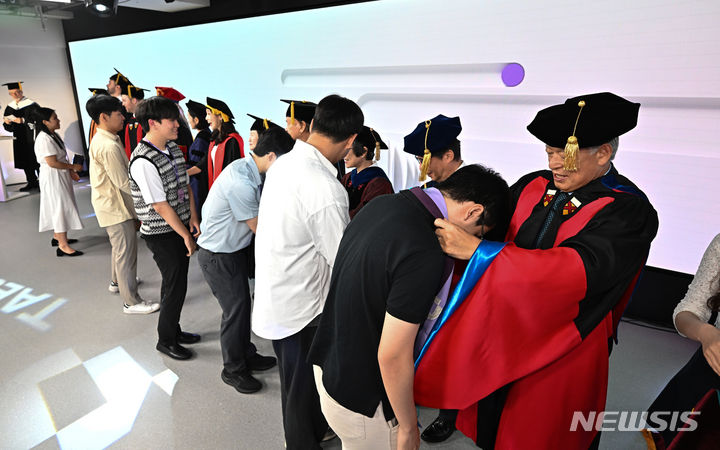 [서울=뉴시스] 김근수 기자 = 염재호 태재대학교 초대 총장이 30일 서울 종로구 태재대학교에서 열린 1기 신입생 입학식에서 신입생들에게 입학 축하 스카프를 목에 걸어주고 있다. (공동취재사진) 2023.08.30. [email protected]