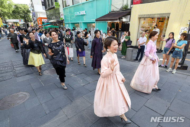 [서울=뉴시스] 황준선 기자 = 2023 인사동 엔틱&아트페어가 개막한 31일 오후 서울 종로구 인사동 거리 일대에서 모던한복 퍼레이드가 펼쳐지고 있다. 2023.08.31. [email protected]