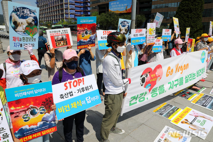 [서울=뉴시스] 배훈식 기자 = 한국채식연합 회원들이 1일 오후 서울 종로구 세종대로사거리 인근에서 제1회 한국 비건의 날을 맞아 비건 채식 촉구 기자회견을 하고 있다. 2023.09.01. [email protected]