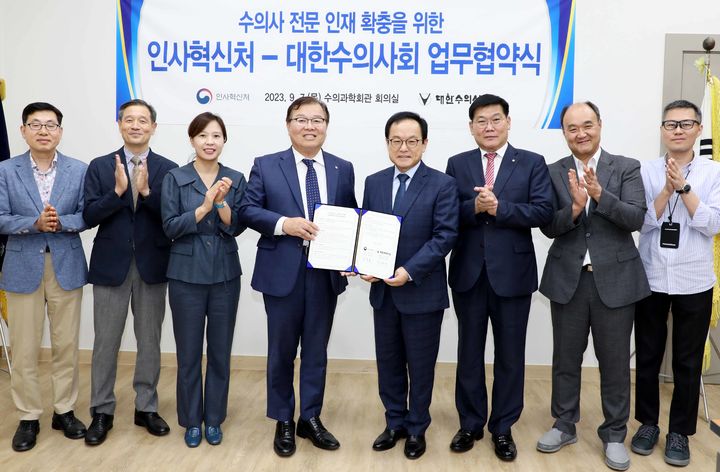 [서울=뉴시스] 고승민 기자 =김승호 인사혁신처장(왼쪽 다섯번째)과 허주형 대한수의사회장(왼쪽 네번째)이 7일 경기 성남시 분당구 수의과학회관에서 '수의사 전문인재 확충을 위한 업무협약'을 체결한 후 참석자들과 기념촬영을 하고 있다. (사진=인사혁신처 제공) 2023.09.07. [email protected] *재판매 및 DB 금지