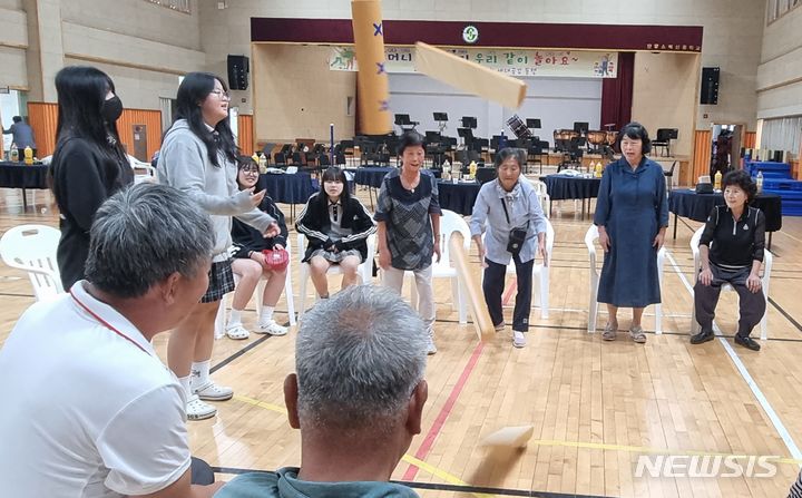 [단양=뉴시스] 이도근 기자= 12일 충북 단양 소백산중 학생들이 세대공감동행 프로그램 '할머니 할아버지 우리 같이 놀아요'에서 지역 어르신들과 함께 윷놀이를 하고 있다. (사진=단양교육지원청 제공) 2023.9.12. [email protected]