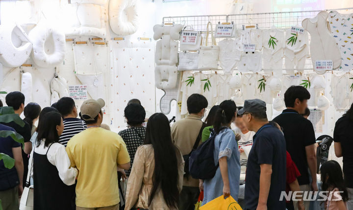 [서울=뉴시스] 황준선 기자 = 17일 오후 서울 강남구 코엑스에서 진행중인 제44회 베페 베이비페어를 찾은 관람객들이 부스를 둘러보고 있다. 2023.09.17. [email protected]