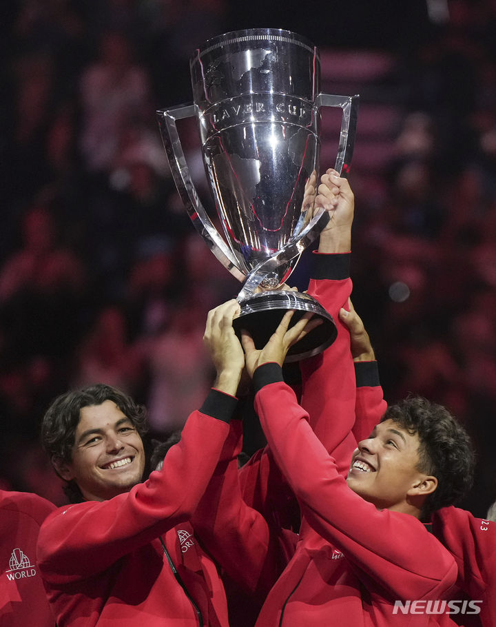 [밴쿠버=AP/뉴시스] 24일(현지시각) 캐나다 브리티시컬럼비아주 밴쿠버에서 열린 2023 레이버컵 테니스 대회에서 '팀 유럽'을 물리치고 정상에 오른 '팀 월드'의 테일러 프리츠와 벤 셸턴(이상 미국)이 레이버컵을 들어 올리고 있다. 팀 유럽과 팀 월드는 각각 유럽과 비유럽 선수 6명으로 구성돼 단·복식 경기를 치르며 역대 5차례의 승부 결과 팀 유럽이 4회, 팀 월드가 1회 우승했었다. 2023.09.25.