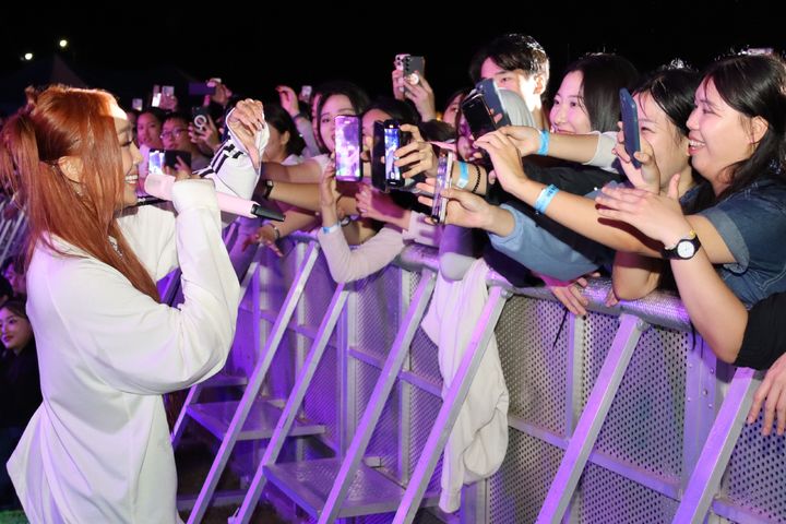 [구미=뉴시스] 박홍식 기자 = 가수 효린이 25일 오후 경북 구미대학교 대운동장에서 열린 '해피 뮤직 페스티벌' 행사에서 학생들과 함께 '터치마이바디'를 열창하고 있다. (사진=구미대 제공) 2023.09.26 [email protected]