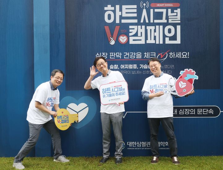 [서울=뉴시스] 황준선 기자 = 세계 심장의 날을 맞아 26일 서울 중구 프레스센터 앞에서 대한심혈관중재학회가 주최한 ‘하트시그널 V 캠페인, 내 심장의 문단속’ 행사에서 조윤형 명지병원 심장내과 교수, 민필기 강남세브란스병원 심장내과 교수, 원기범 중앙대학교 광명병원 순환기내과 교수가 캠페인을 소개하고 있다. (사진 = 대한심혈관중재학회 제공)2023. 09. 26. [email protected]
