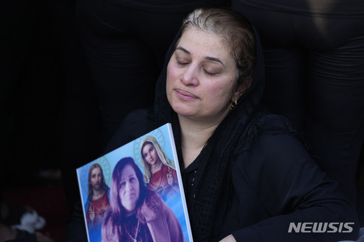 [함다니야=AP/뉴시스] 27일(현지시각) 이라크 니네베주 함다니야에서 결혼식장 화재 희생자 장례식이 열려 친지들이 애도하고 있다. 이라크 당국은 전날 발생한 화재로 지금까지 최소 110명이 숨지고 200명 가까운 부상자가 발생했다면서 사망자 숫자는 더 늘어날 것으로 내다봤다. 정확한 화재 원인은 밝혀지지 않았으나 예식장에서 사용한 폭죽이 천장에 옮겨붙은 것으로 추정하고 있다. 2023.09.28.