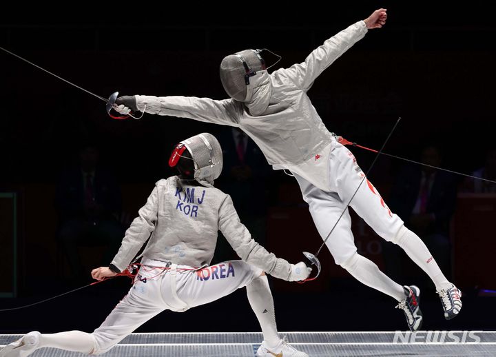 [항저우=뉴시스] 조수정 기자 = 28일(현지시간) 중국 항저우 전자대학 체육관에서 열린 2022 항저우 아시안게임 펜싱 사브르 남자 단체전 한국 대 중국 결승, 김준호(왼쪽)가 공격하고 있다. 결과는 금메달. 2023.09.28. [email protected]