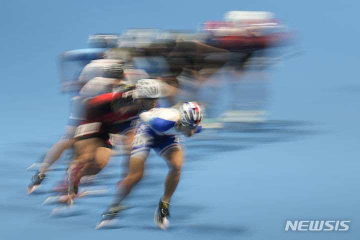 [항저우=AP/뉴시스] 한국 최인호가 30일 중국 항저우 첸탕 롤러스포츠센터에서 열린 2022 항저우 아시안 게임남자 스피드 롤러스케이팅 10000m 포인트 제외(EP) 레이스 결승에서 선두를 달리고 있다. 이날 최인호는 동메달을 함께 출전한 정병희는 금메달을 획득했다. 2023.09.30.