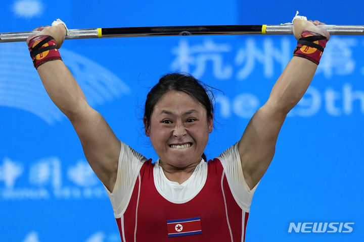 [항저우=AP/뉴시스] 북한 리성금이 30일 중국 항저우 샤오산 스포츠 센터 체육관에서 열린 2022 항저우 아시안게임 여자 49kg급 인상에서 바벨을 들어 올리고 있다. 리성금은 이날 인상 92kg, 용상 124kg, 합계 216kg을 들어 장후이화가 가진 합계 세계 기록(215kg)보다 1kg을 더 들어올리며 우승을 차지했다. 2023.09.30.