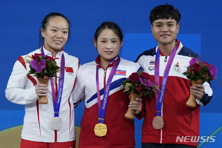 [항저우=AP/뉴시스] 북한 리성금(가운데)이 30일 중국 항저우 샤오산 스포츠 센터 체육관에서 열린 여자 49kg급 시상식에서 금메달을 목에 걸고 기념촬영하고 있다. 리성금은 이날 인상 92kg, 용상 124kg, 합계 216kg을 들어 장후이화가 가진 합계 세계 기록(215kg)보다 1kg을 더 들어 올리며 우승을 차지했다. 2023.09.30.