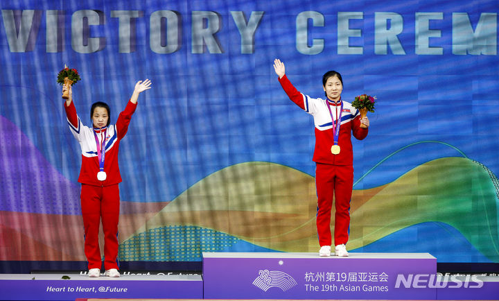 [항저우=뉴시스] 정병혁 기자 = 30일 중국 항저우 샤오산 스포츠센터에서 열린 2022 항저우 아시안게임 역도 여자 55kg급에서 금메달을 차지한 북한 강현경과 은메달을 차지한 리수연이 손을 흔들고 있다. 2023.09.30. [email protected]