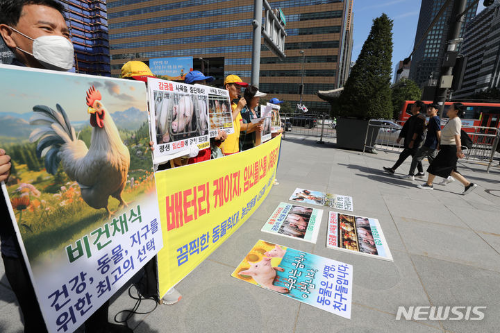 [서울=뉴시스] 김명원 기자 = 한국동물보호연합 회원들이 2일 서울 종로구 광화문 이순신 동상 앞에서 ‘세계 농장동물의 날’ 맞아 공장식 축산과 감금틀 사육의 중단 및 비건 채식을 촉구하는 기자회견을 하고 있다. 2023.10.02. [email protected]