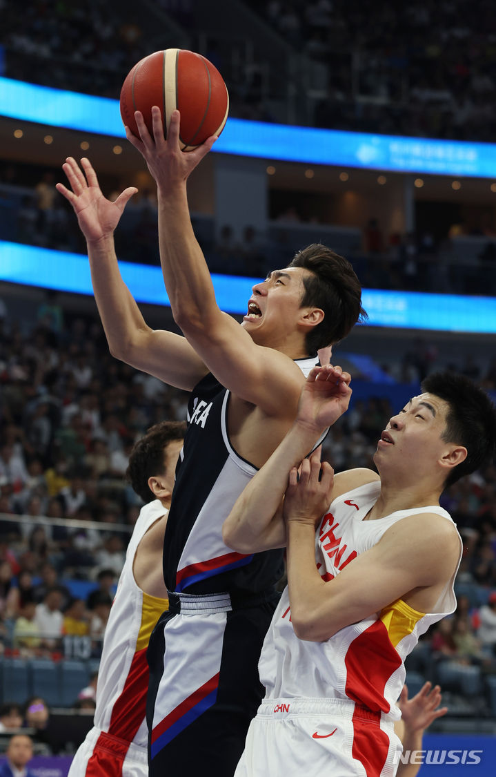 [항저우=뉴시스] 고승민 기자 = 3일 중국 항저우 올림픽 스포츠센터 농구장에서 열린 2022 항저우 아시안게임 남자 농구 8강 한국 대 중국 경기, 한국 양홍석이 골밑슛을 시도하고 있다. 2023.10.03. [email protected]