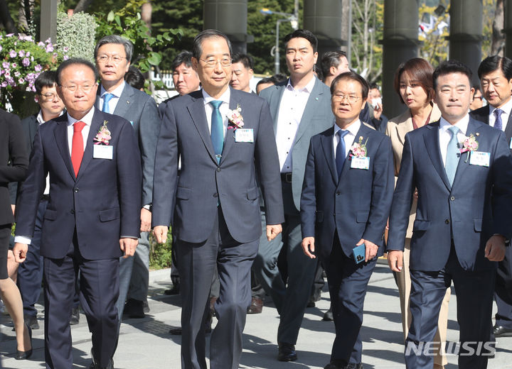 [서울=뉴시스] 김명원 기자 = 한덕수 국무총리가 5일 오전 서울 종로구 광화문 광장에서 열린 2023 리스타트 잡페어에 윤재옥 국민의힘 원내대표, 이정식 고용노동부 장관, 이영 중소벤처기업부 장관 등과 참석하고 있다. 2023.10.05. [email protected]