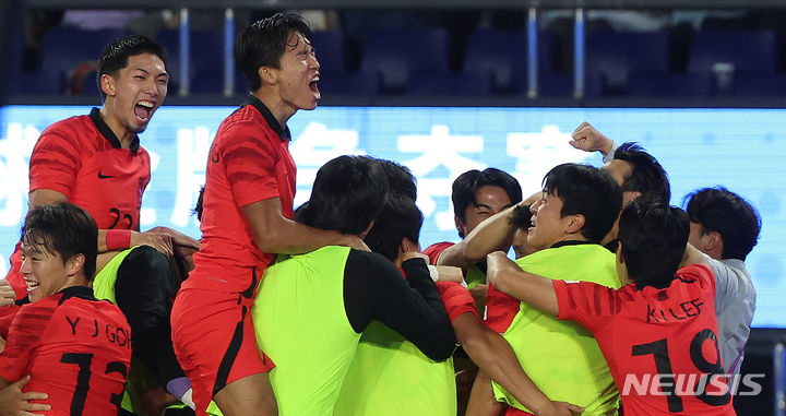 [항저우=뉴시스] 고승민 기자 = 7일 중국 항저우 황룽스포츠센터 스타디움에서 열린 2022 항저우 아시안게임 남자 축구 결승 한국 대 일본 경기, 후반전 한국 조영욱이 역전골을 넣은 뒤 동료들과 환호하고 있다. 2023.10.07. [email protected]