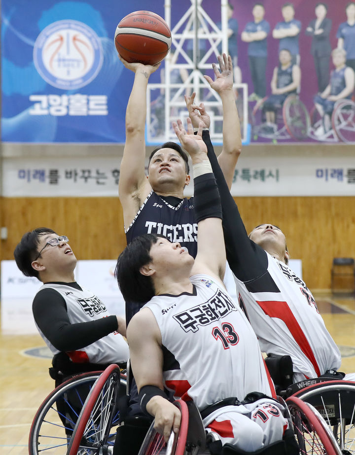 [서울=뉴시스] 김선웅 기자 = 8일 고양홀트종합체육관에서 열린 2023 KWBL 휠체어농구리그 무궁화전자와 춘천 타이거즈의 경기에서 춘천 조승현이 무궁화전자 선수들과 볼다툼을 하고 있다. (사진=한국휠체어농구연맹 제공) 2023.10.08. [email protected]