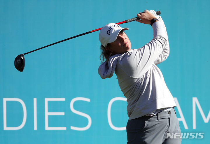 [파주=뉴시스] 김진아 기자 = 로렌 코플린이 22일 경기 파주 서원밸리 컨트리클럽 서원힐스에서 열린 LPGA 투어 'BMW 레이디스 챔피언십 2023' 파이널 라운드 1번홀에서 티샷을 하고 있다. 2023.10.22. [email protected]