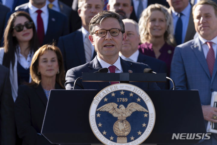 [워싱턴=AP/뉴시스] 마이크 존슨(공화·루이지애나) 신임 미 하원의장이 25일(현지시간) 워싱턴 국회의사당에서 취임 기자회견을 하고 있다. '친(親)트럼프' 인사로 분류되는 존슨 의원이 케빈 매카시 전 의장이 해임된 지 22일 만에 새 하원의장으로 선출됐다. 2023.10.26.